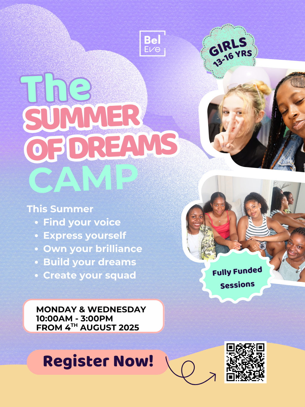Join us at BelEve’s Summer of Dreams, the ultimate girls-only empowerment camp designed specifically for teens aged 13 -16 year old. This is not your typical summer programme; it’s a vibrant space where confidence meets creativity, sisterhood thrives, and your dreams take center stage.